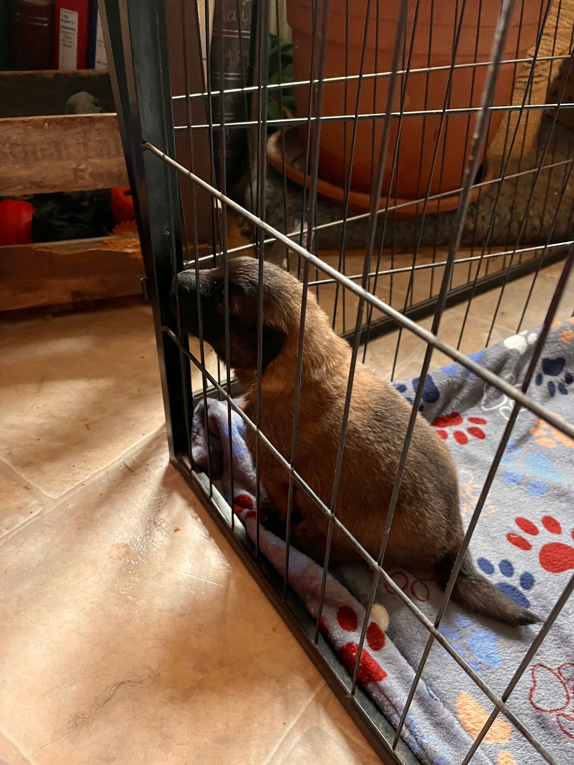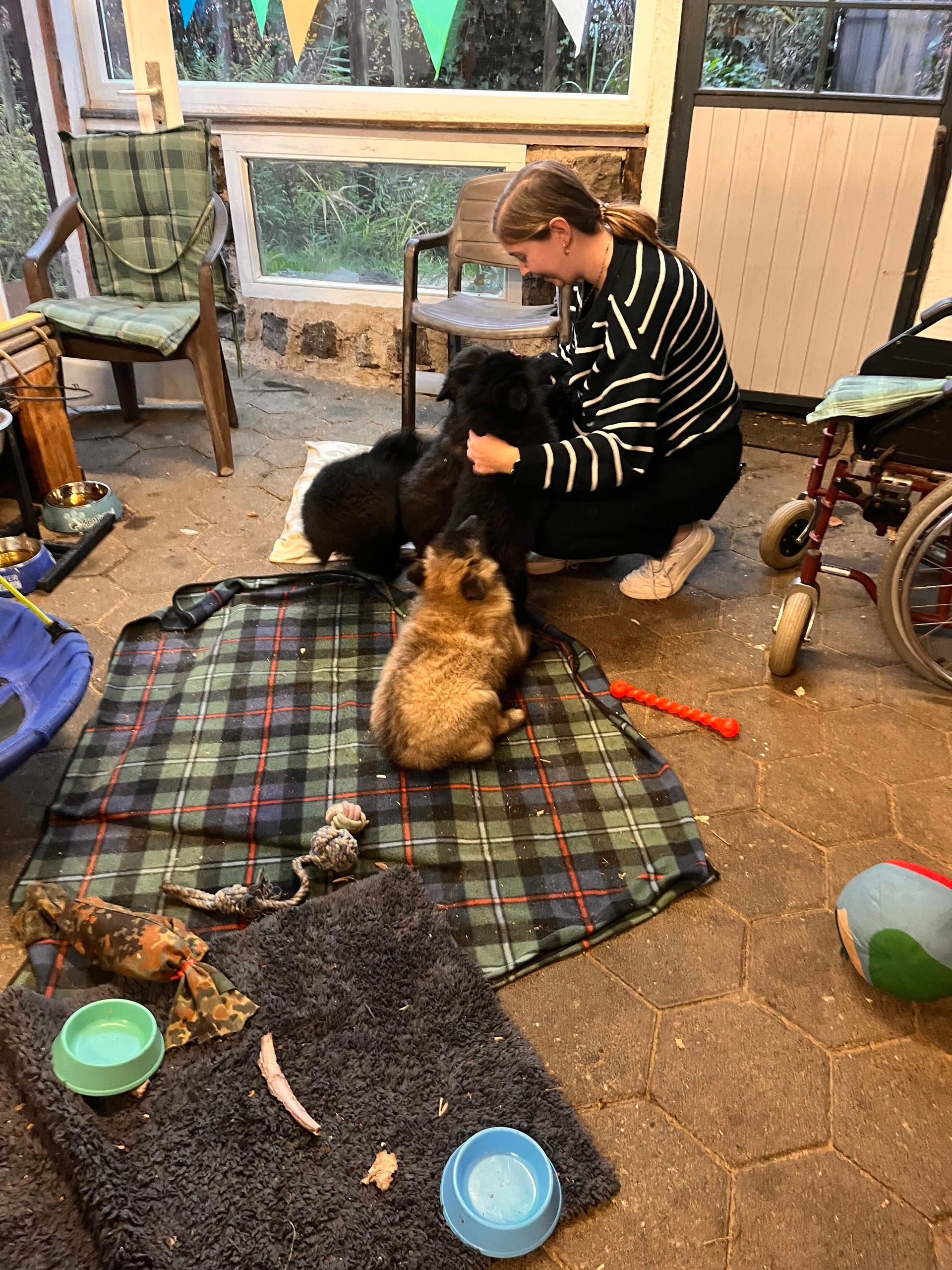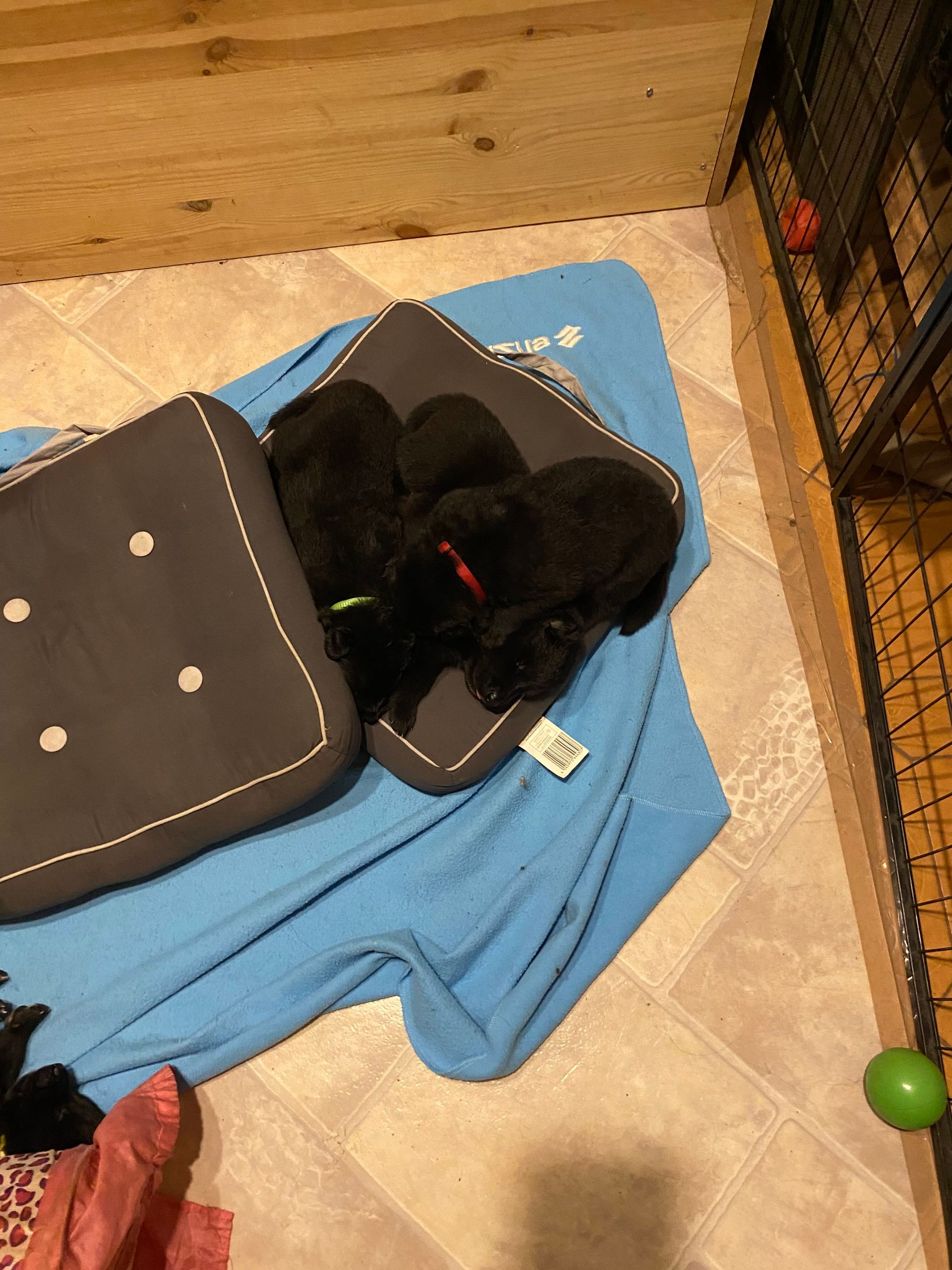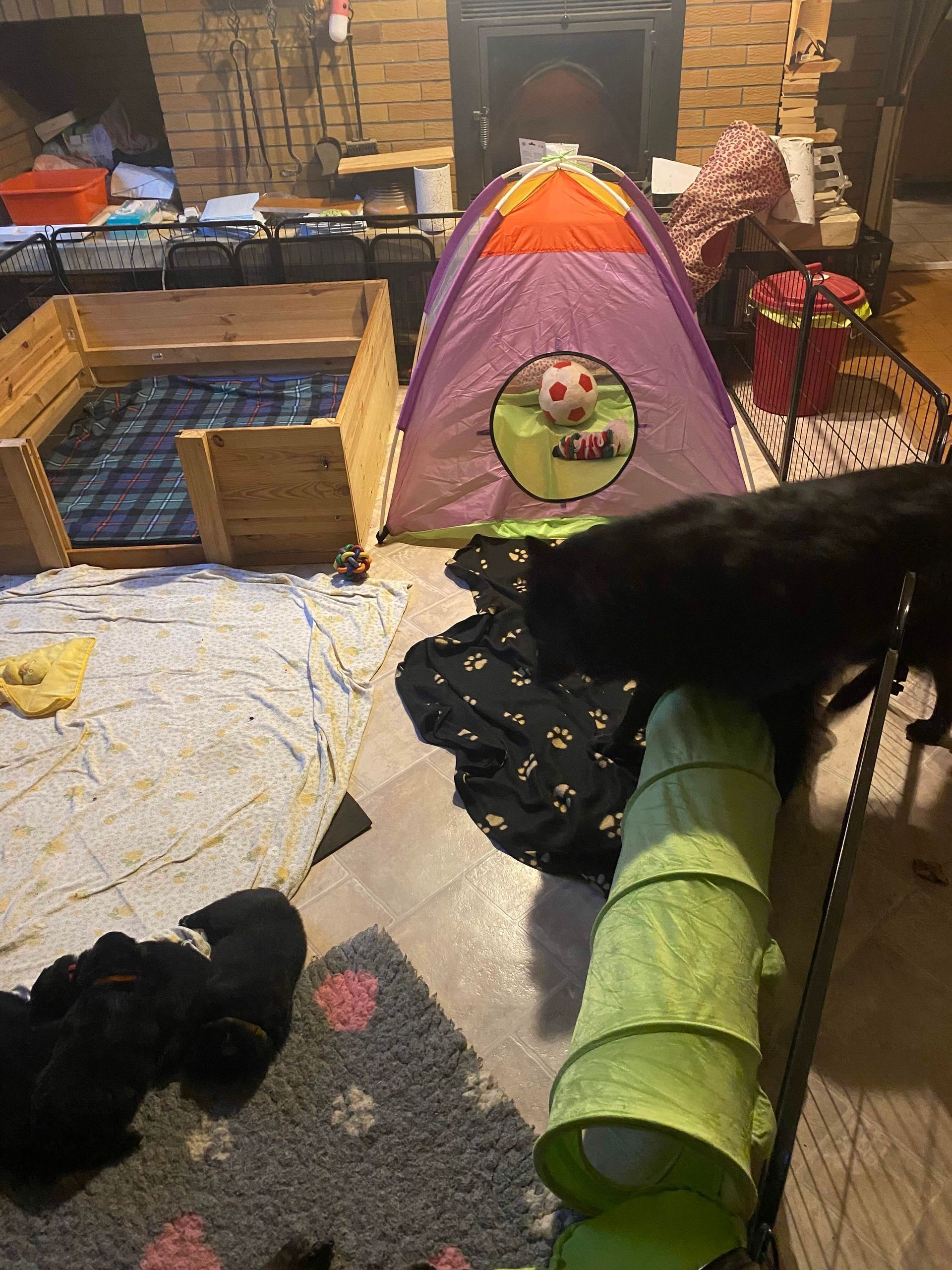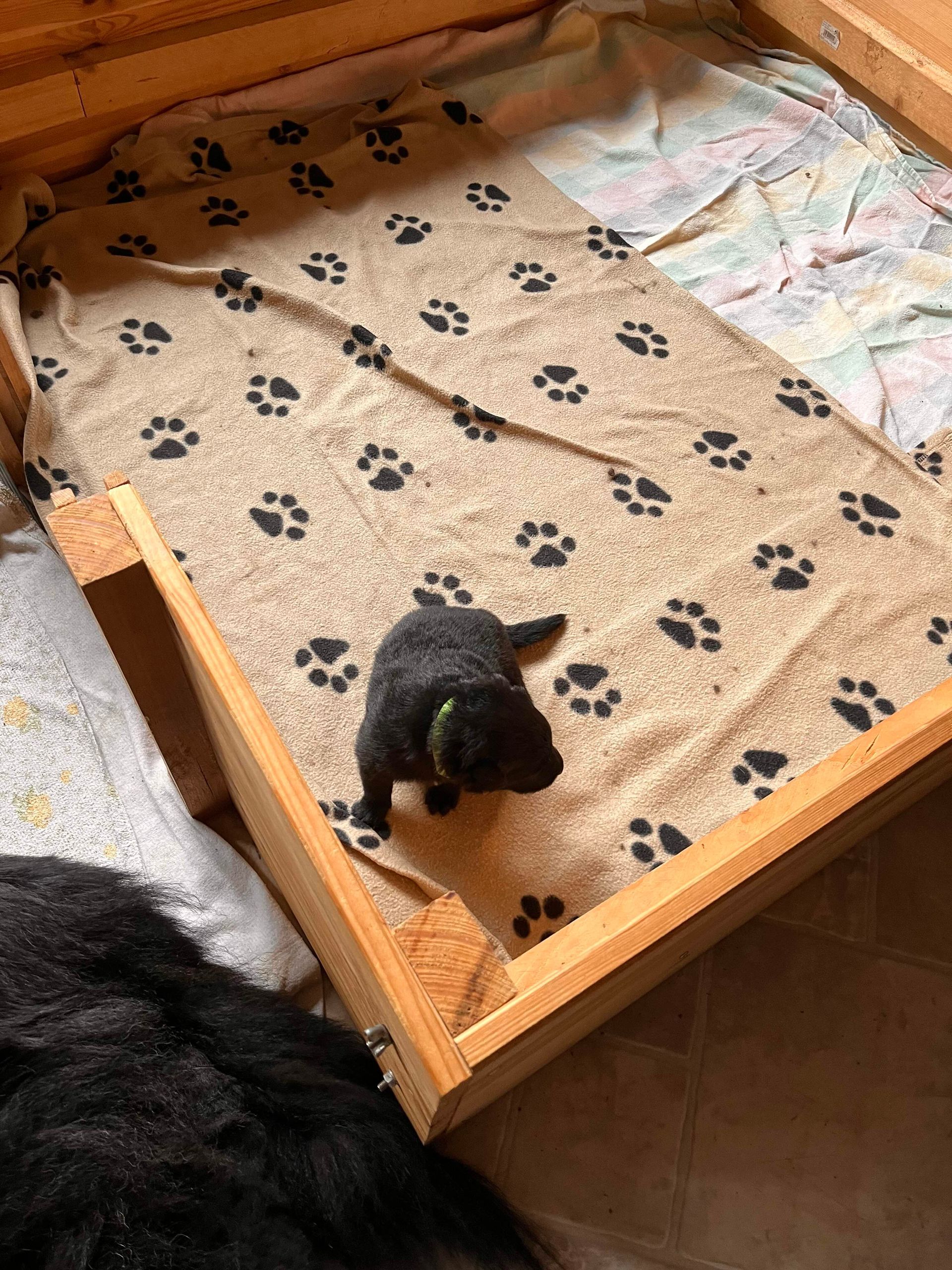 Fleur stillt jetzt nur noch sporadisch, weist die kleinen auch rigoros zurecht, rechts ein kleiner Blick durch das Welpenhaus, Fleur schläft zumeist bei Doris, neben den kleinen.