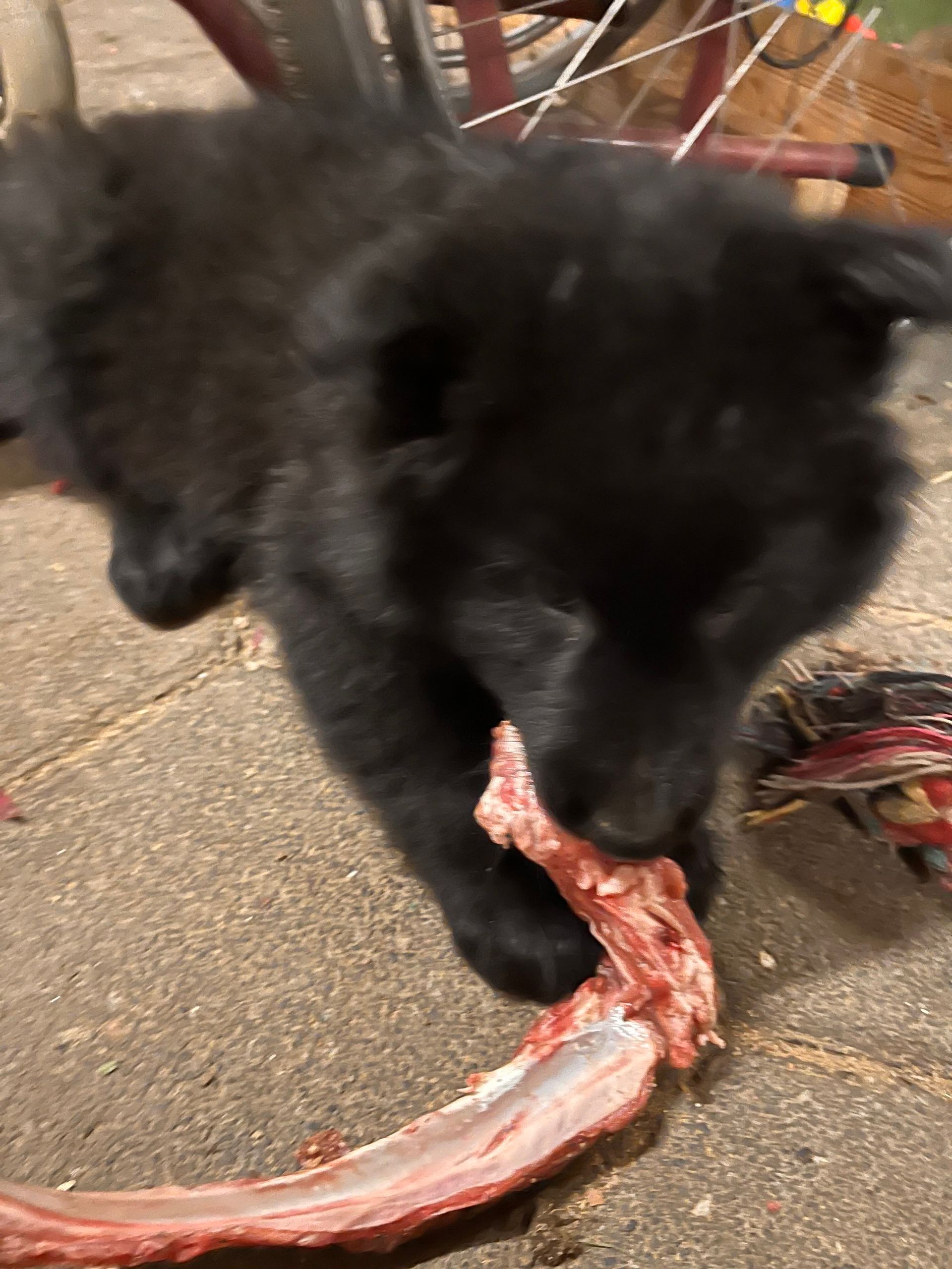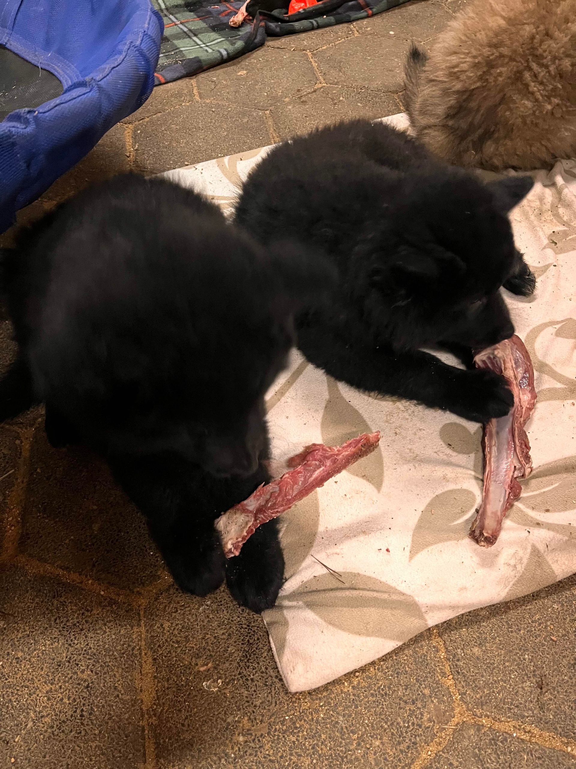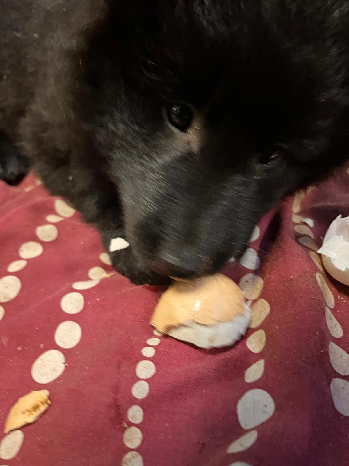 Als leckeres füttern wir überwiegend selbst gedörrte Innereien vom Rind. Heute gab es auch das erste mal Eierschalen.