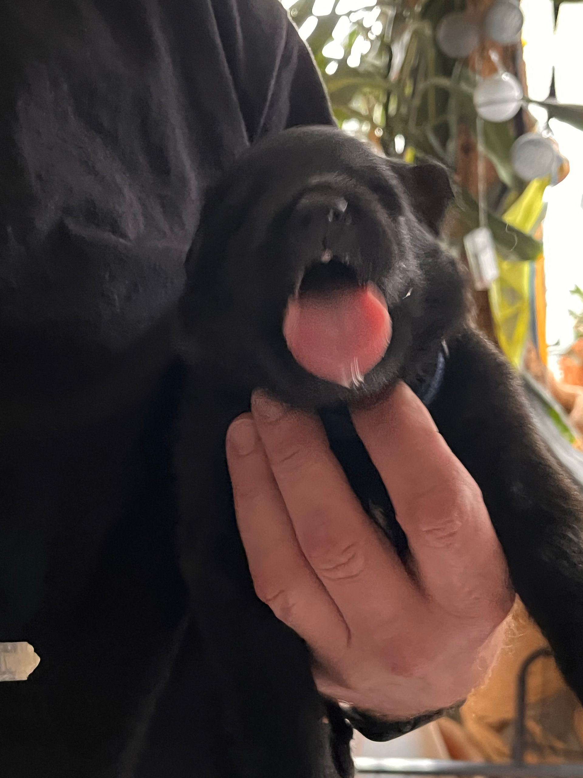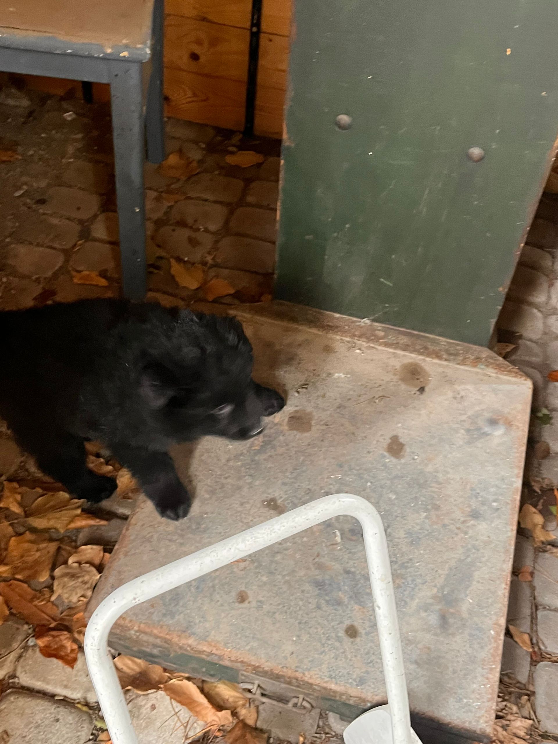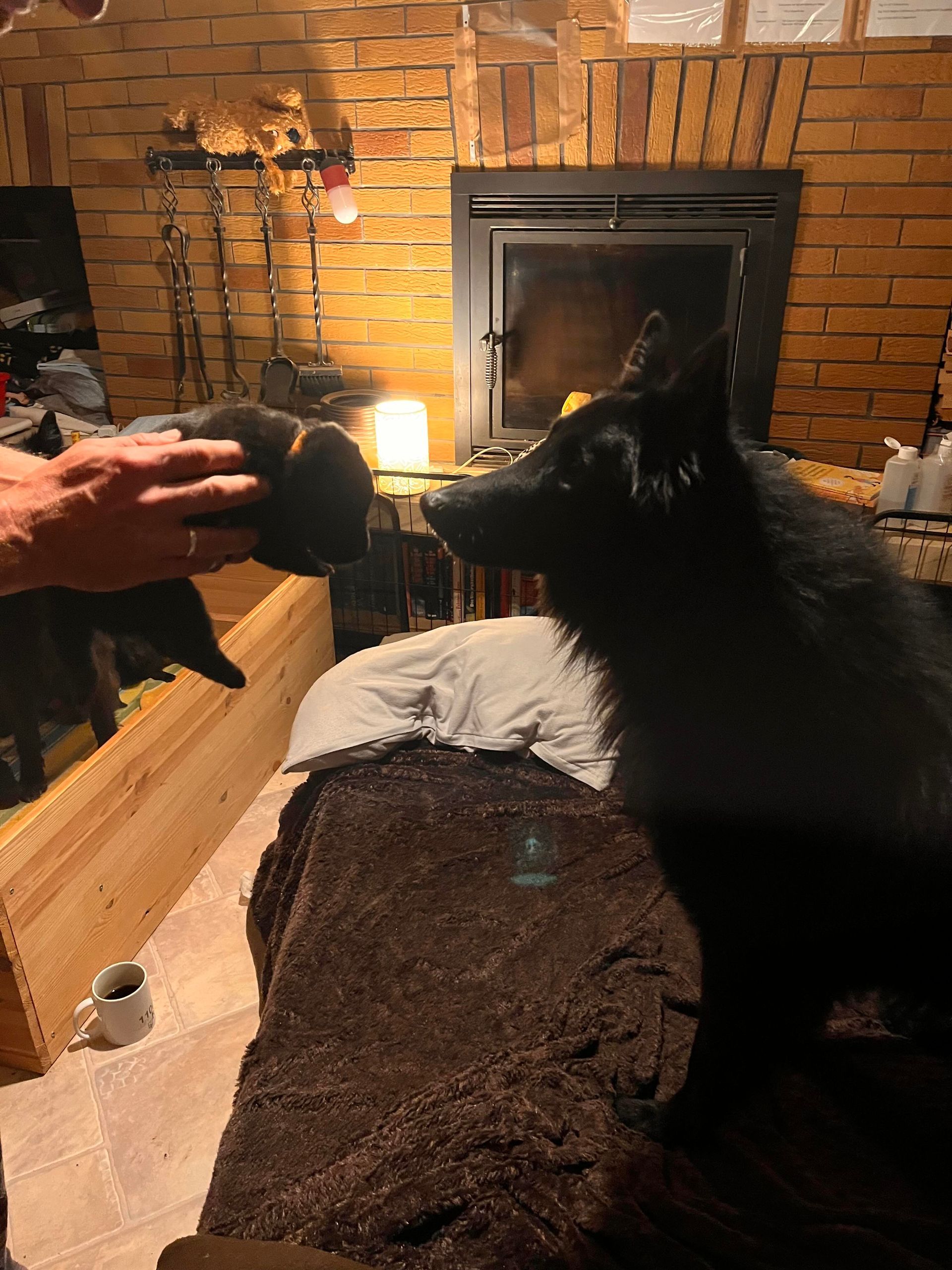 So die Augen sind auf, die kleinen verlassen die Wurfkiste, jetzt darf auch Pepe und Aura mal kurz zu den Welpen, hier begrüßt er Diva,