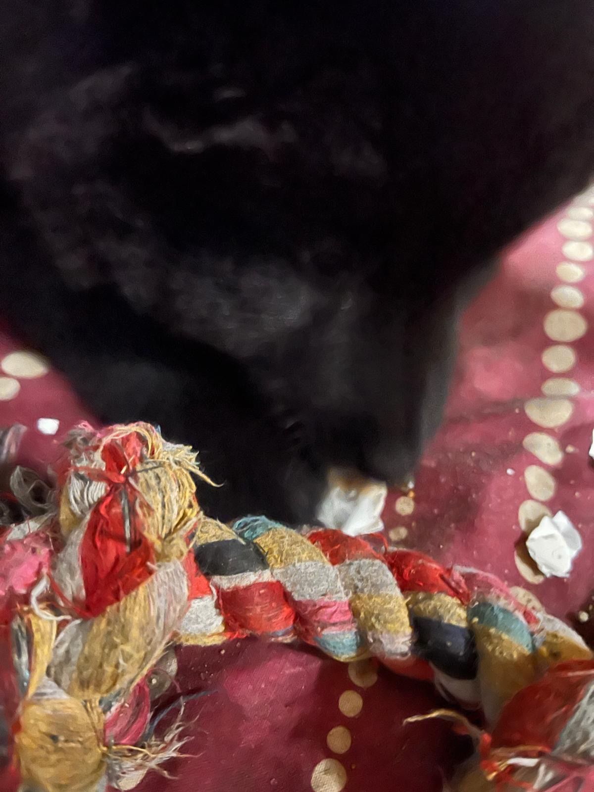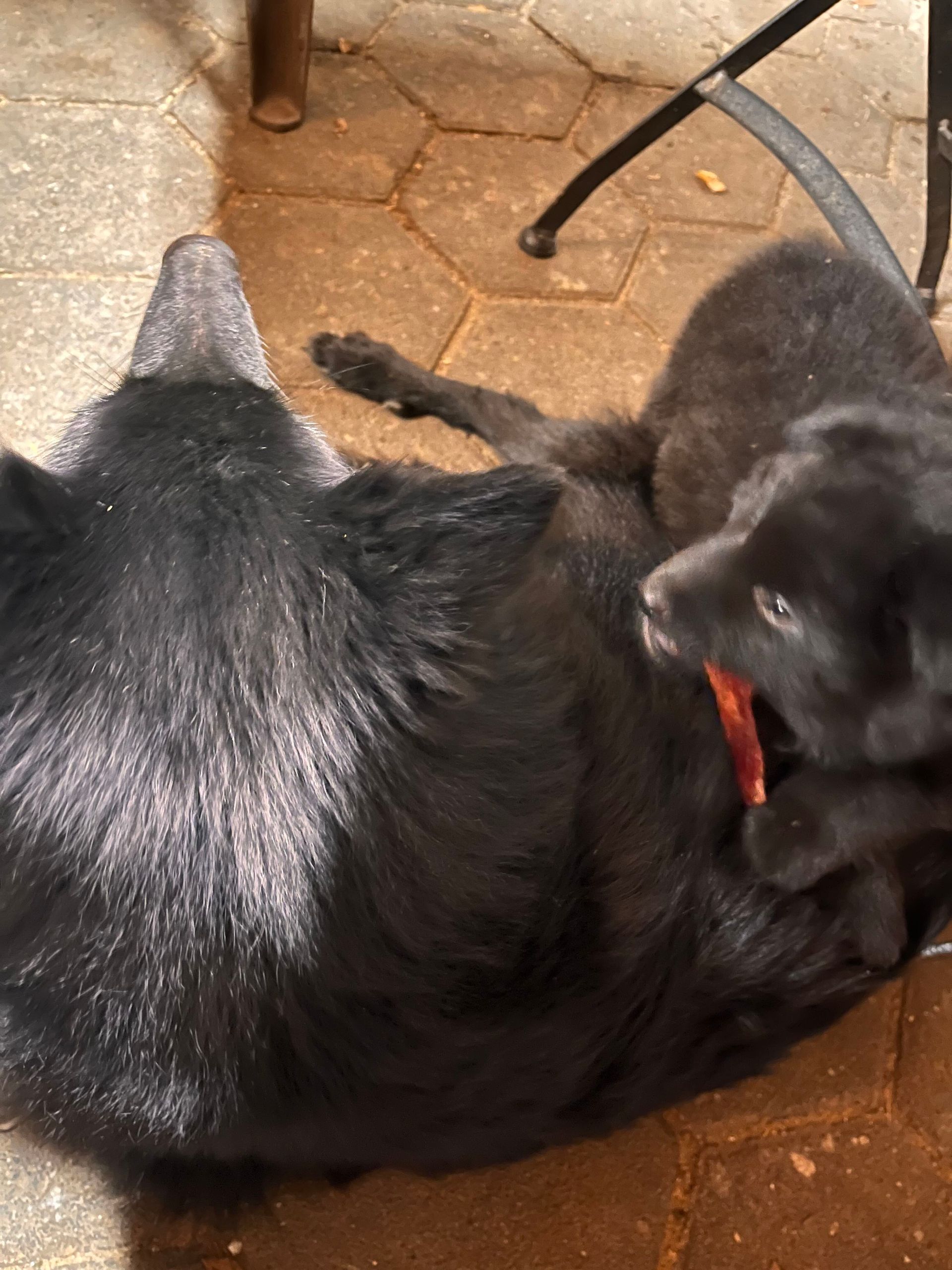Der Sandkasten ist definitiv Danger, er verteidigt ihn gegen alle. In der Mitte gab es zum ersten mal einen Knochen.