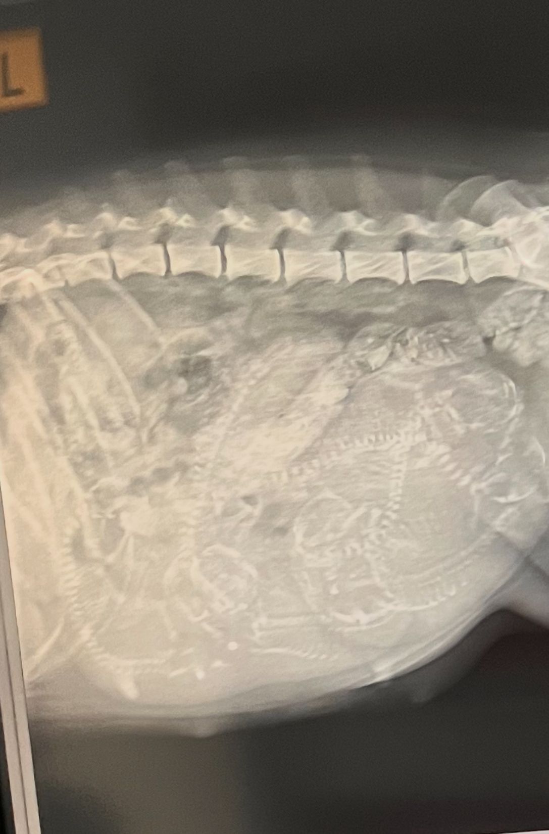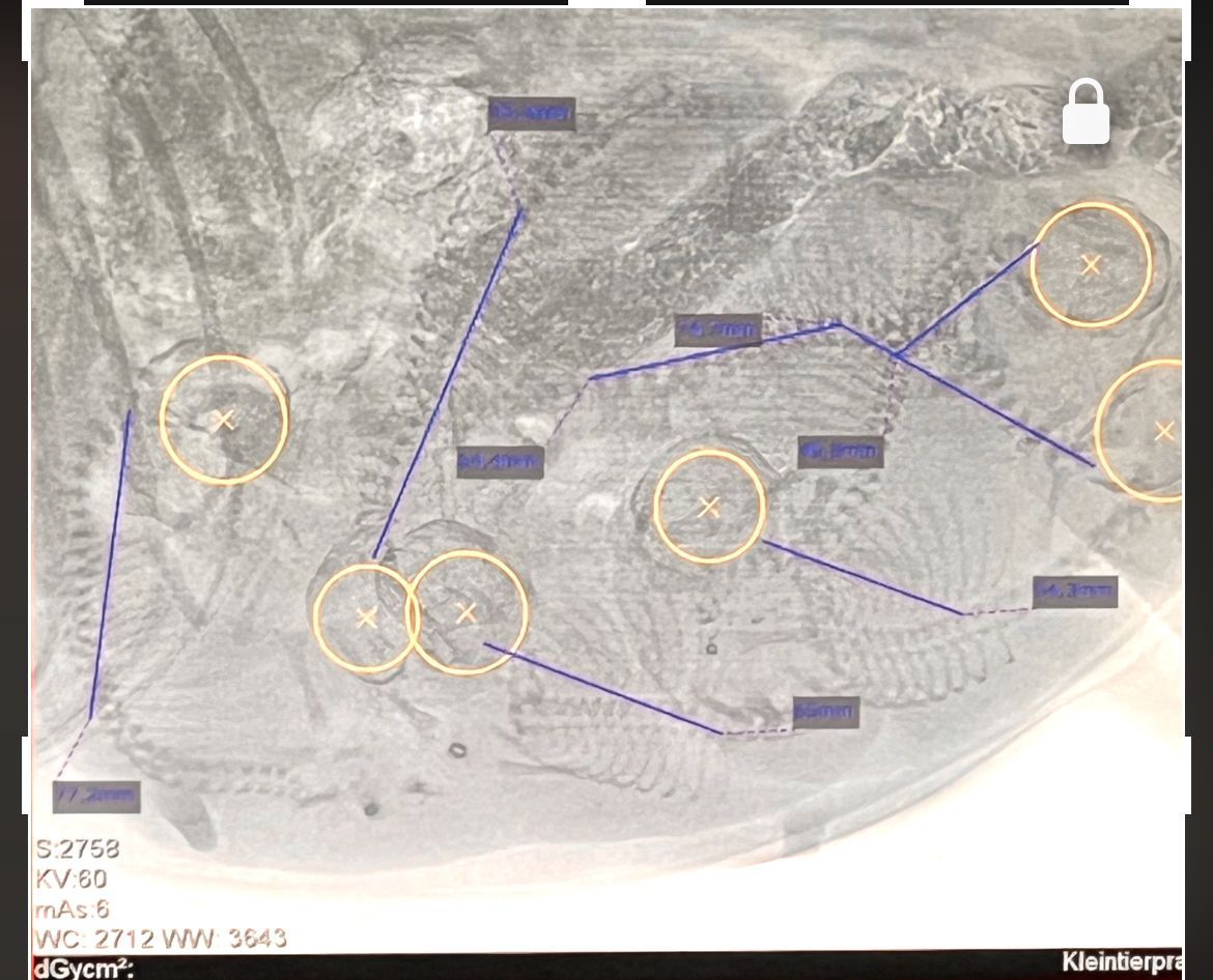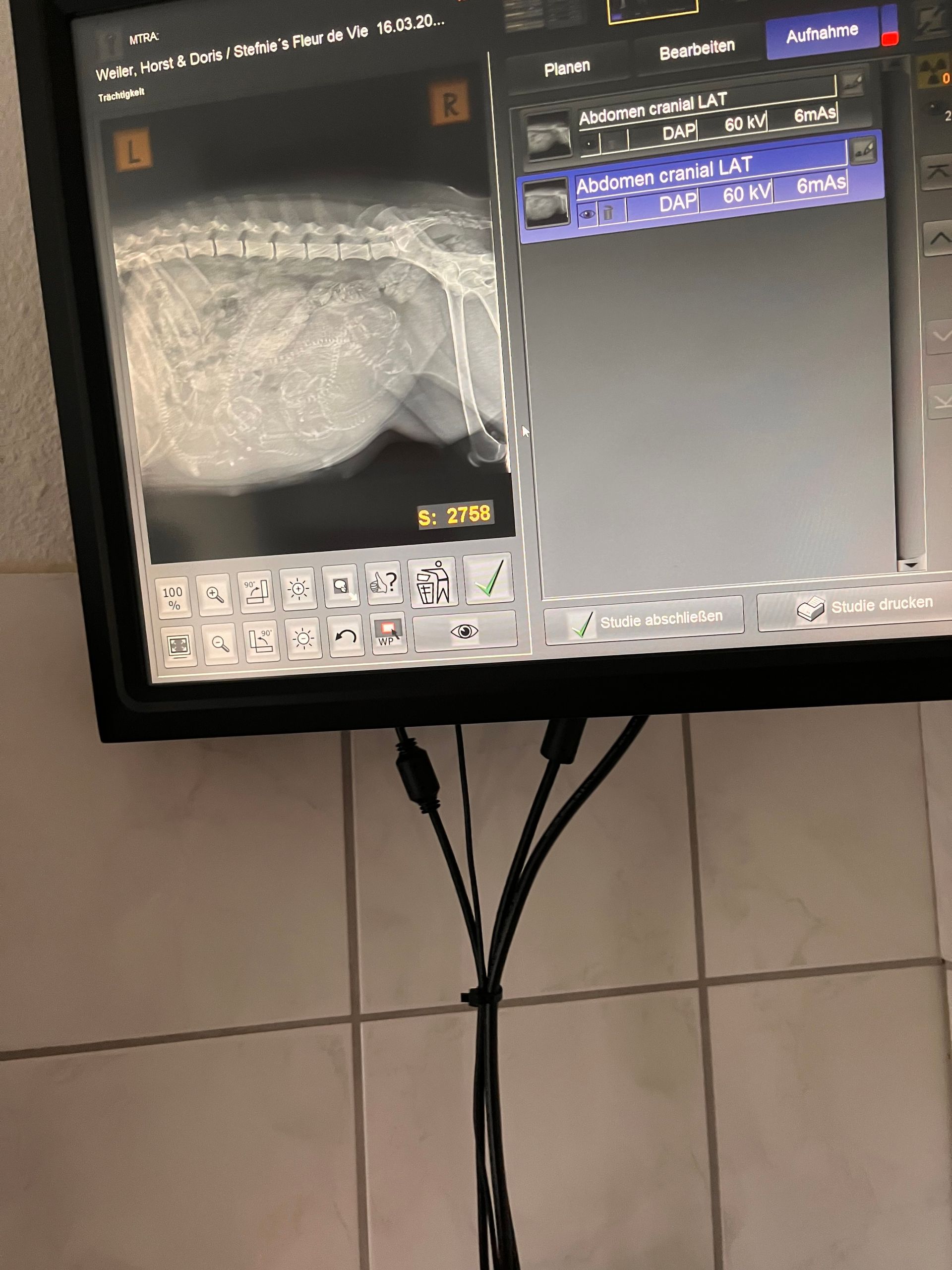 Heute war Röntgen angesagt, es bleibt bei sechs bis sieben, leider war der Darm von Fleur noch voll so das eventuell jemand dahinter verstecken könnte.