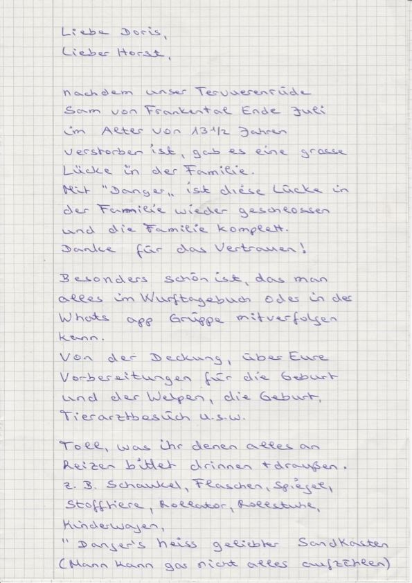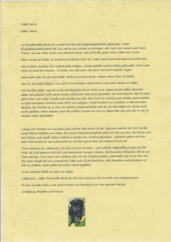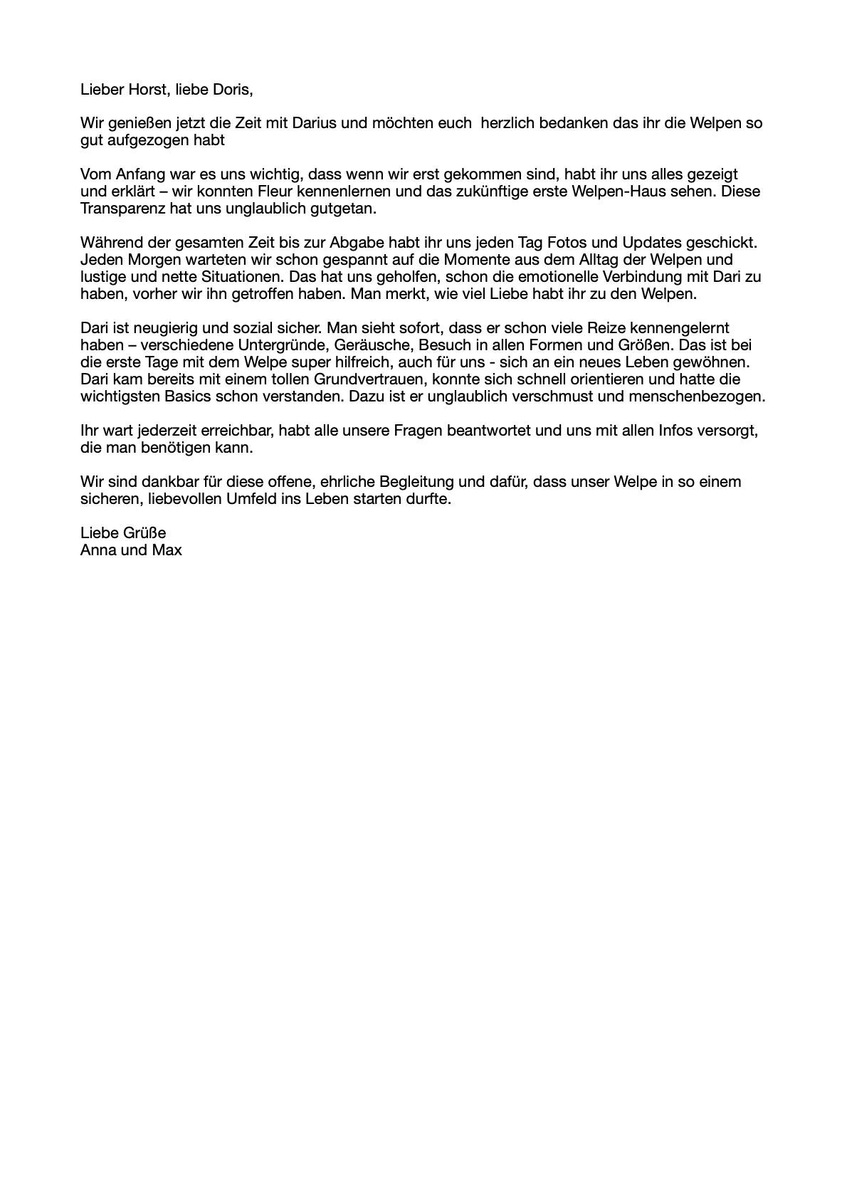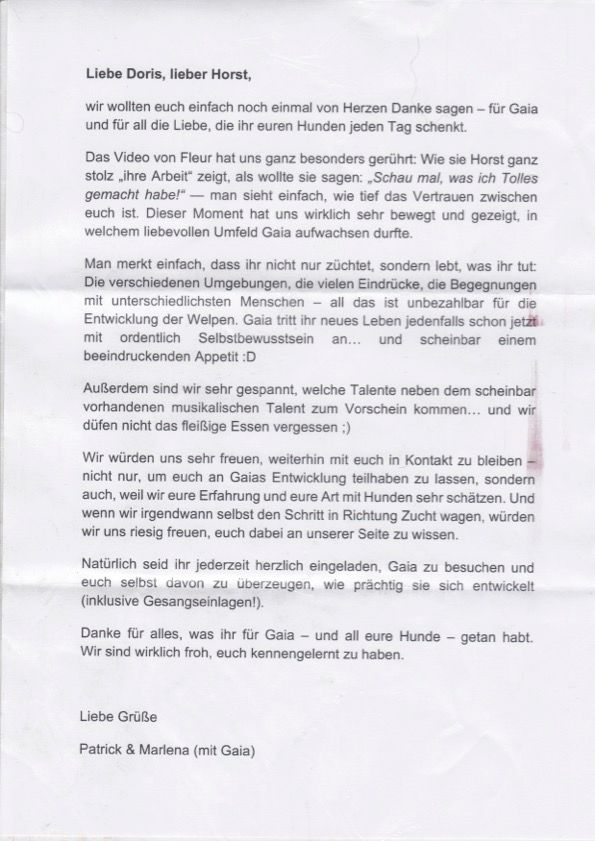 Wir bitten unsere Welpenkäufer uns eine Rückmeldung zu geben wie sie die Welpenzeit mit uns erlebt haben, natürlich auch gerne Verbesserungsvorschläge.